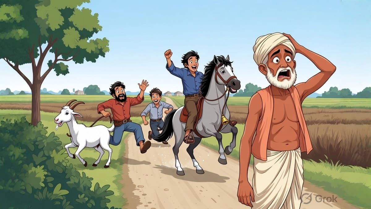 | 18 | "अगर तुम मुझे अपना घोड़ा दे दो, तो मैं उसका पीछा करके तुम्हारी चुराई गई बकरी वापस ला सकता हूँ!" | "If you give me your horse, I can chase after him and bring back your stolen goat!" |