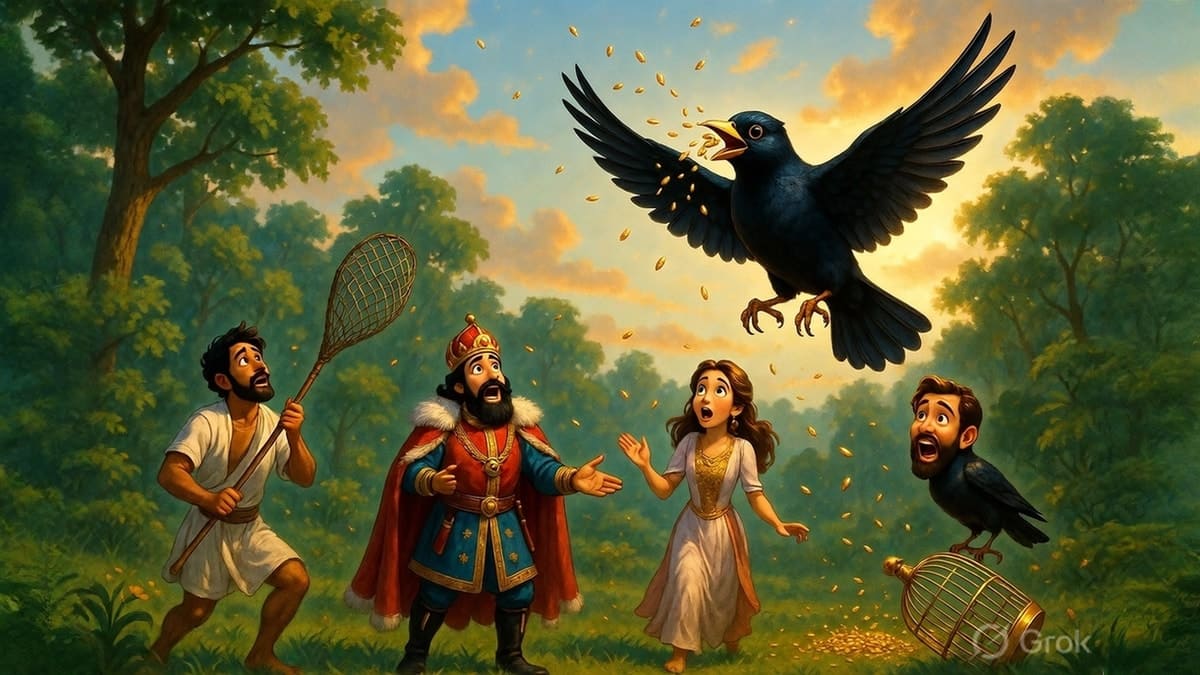 एक जंगल मे एक ऊँचे पेड़ पर एक काली चिडि़या रहती थी। जब वह गाती तो उसकी चोंच से सोने के दाने झड़ते थे। संयोग से एक दिन एक बहेलिए की नजर उस पर पड़ गयी। चिडि़या के मुँह से सोने के दाने झरते देख वह फूला नही समाया। उसने मन ही मन कहा, "वाह! कितनी अच्छी तकदीर है मेरी! मैं इस चिडि़या को पकड़ कर अपने घर ले जाऊँगा। यह मुझे रोज सोने के दाने देगी। मैं धनवान हो जाऊँगा।"